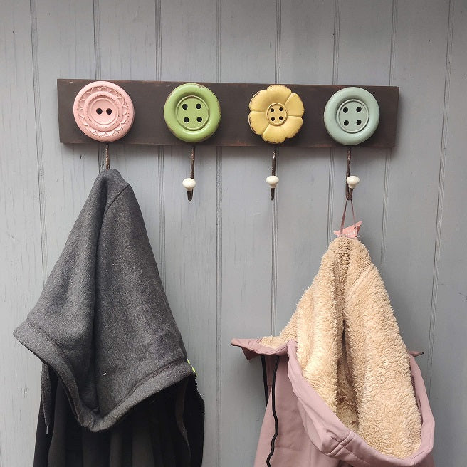 Den skønne knagerække kan evt. bruges i en stofforretning, strikkebutik, café eller lign.